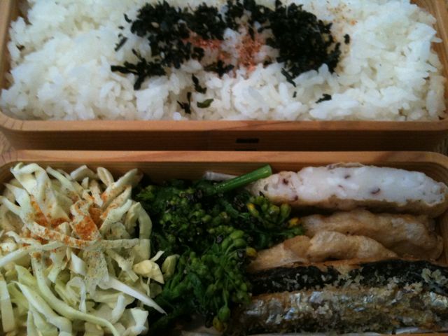 今日の弁当は、キャベツ、いわし、菜の花、たこ天ぷら。