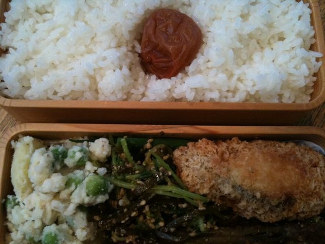 今日の弁当は、じゃがいも、ししゃも、豆苗(とうみょう)、さやえんどう、魚フライ。