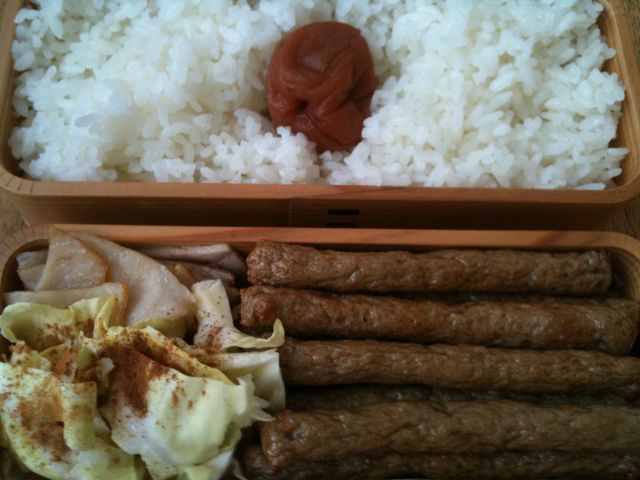 今日の弁当は、じゃこ天、ハム、キャベツ、梅干し。なぜか、バウハウス、モダニズム建築のような直線的おかず配列になってしまいました。じゃこ天の多いのは賞味期限の都合ということで。