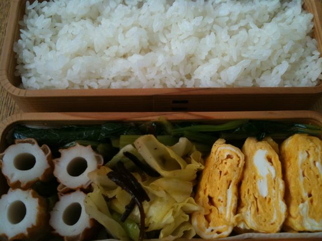 今日の弁当は卵焼き、小松菜、ちくわ、塩昆布キャベツ。