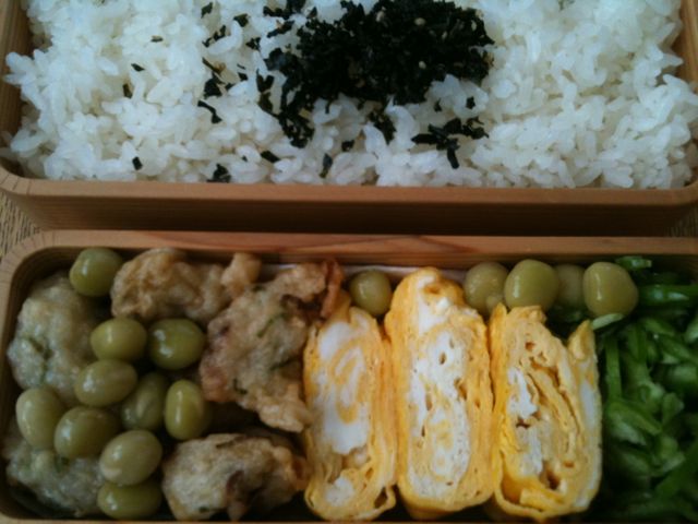 今日の弁当はピーマン、豆、たこの天ぷら、卵焼き。