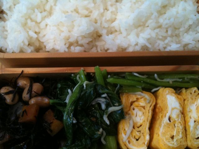 今日の弁当は、ひじき、卵焼き、小松菜。