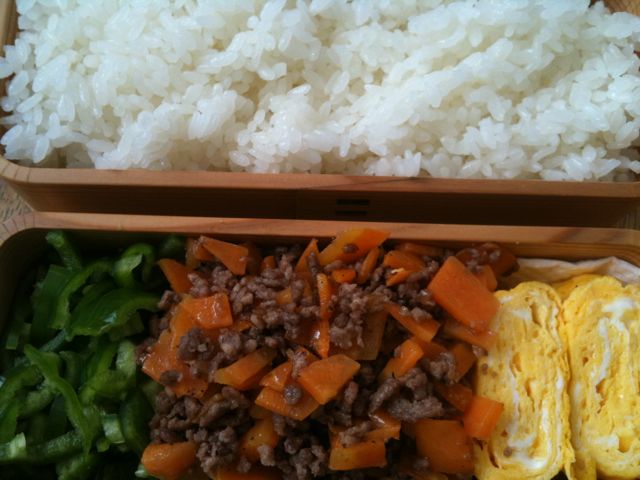 今日の弁当は、卵焼き、にんじん、ひき肉、ピーマン。