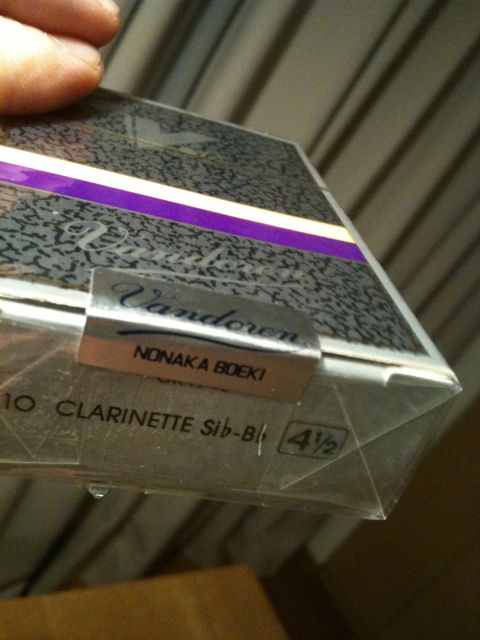 クラリネットのリードの話です。僕の手元のバンドーレンのリードが偽物に見えてきました…。これ、広島市内の店で2、3週間前に買ったやつです。シールは他の箱は「NONAKA」この箱だけは「NONAKA BOEKI」厚み4-1/2サイズのを 500円の安売りだからというので(普段は厚み3番で2000-3000円くらい)買ったんですけどね。