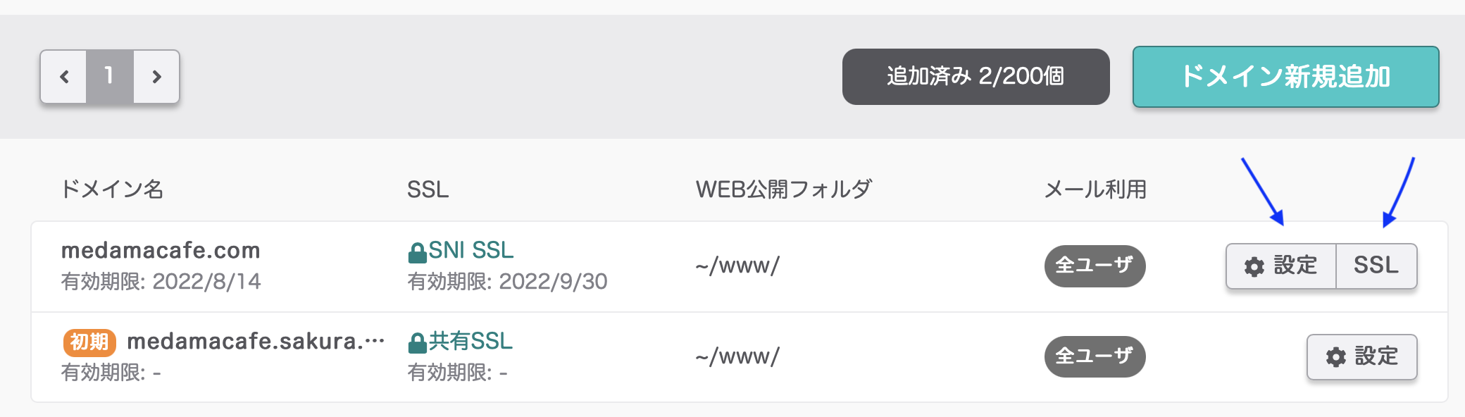 ドメイン名 medamacafe.comの「設定」ボタンの右「SSL」ボタンで、「新しい設定の有効化」