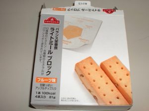 最近ジャスコでカロリーメイトによく似た「トップバリュライトミールブロック フルーツ味」を買いました。81gで100kcalというあたりも本家カロリーメイトブロックと同じサイズ。値段が128円と安いしあまり期待してなかったのですが、これが意外においしい。リンゴ果肉のような粒の感触も良し。これ割とおすすめではないかと思います。しかもビニール袋もちょっと開けやすい。こぼれにくい。イオンのオンラインショップでも並んでいますが、元が安いので送料考えると店頭で買うのがよさそうです。(フルーツとチョコ味がありますが、まだチョコ味は食べていません。)参考に調べてみるとカロリーメイト同盟というサイトもありました。結構多いですね。カロリーメイトファン。僕も割と好きなほうなんですけど。今はジャスコ版に転向しそうです。