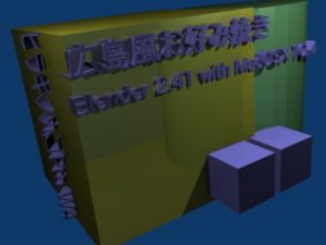 「3Dテキスト」「立体文字」「3D文字」とか呼び名も決まっていないようですが、Blender 2.41の立体文字を試しました。MacOSX 10.4のシステム用フォントから呼び出しロード(装着)して立体化して使えます。3D画面で直接は書けませんがテキストエディタでUTF-8コードで保存すればOK。画面の中で立体文字と透明素材と複数の光源を組み合わせると粘土アニメとも実写とも違うアニメが作れそうな予感です。(以下、立体文字手順)(1)書きたい字のテキストファイルを準備しUTF-8で保存。(2)BlenderでメニューのAdd – Textでテキストオブジェクト生成。(3) 右下fontパネルのLoadボタンで(MacOSXの場合)System – Library – FontsをたどりOsaka.dfont等を選択。「..」で上位フォルダへ移動可能。(4)フォント選択ポップアップをbuilt-in からOsaka等に変更(5) insert textボタンで自分の用意した日本語テキストファイルを選択。(6)日本語文字が出るので、そのEdit Modeのまま下のCurve and Surface パネル内部の「Extrude」数値を増やせば文字の厚みがつく。(7)ひらがな、カタカナならinsert textボタンでなく、右下charパネル(character)で unicode table – Hiraganaなどでクリック入力も可能。曲線にそって文字を並べたりするのはまた後日。