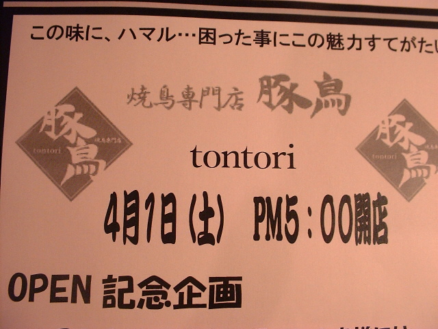 西区己斐本町に焼鳥の店 広島 X Facebook はてブ Pocket LINE コピー 2006.04.012019.08.15 焼鳥専門店「豚鳥」(とんとり)が4/1土曜(今日)新規開店します。ひらの眼科の目の前、己斐ショッピングセンター(広島市西区己斐本町2丁目13-28)です。僕が普段酒をのまないので焼き鳥事情は詳しくないのですが。たぶんこの近辺には焼き鳥の店は少なかったと思うので気になる存在です。