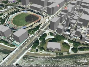 他のブログでとりあげている人も多いと思いますが新しいGoogle Earthを動かしました。日本主要都市の建築物データが見事に三次元化(3D)されています。広島市内のビルも民家も全部3D。建物高さデータは地図業者から買ったものかなと思うのですがどうやっているんでしょう。(島根県松江市のように写真が低解像度でも建物は細かいのが謎)さて、広島市内で気になる物その1、原爆ドーム。衛星写真は被爆後の原爆ドームの写真ですが三次元化したモデルは被爆前の産業奨励館の姿に似ています。参考として読売新聞記事「広島・昭和20年8月6日」や「原爆ドームの歴史」、ナック映像センターをどうぞ。気になるその2,市民球場。残念ながら複雑な形の球場をGoogle職人があきらめたのか(自動立体判定ソフトが放棄したのか)球場は平面のままであります。ビッグアーチも同様に平面。なお、ついでに西区古田台のレストラン付近をGoogle Earthで見ると「ゾーナイタリア」有り、「ベルビュー」は無し(建築前の写真)、「それいゆ」は有り、という感じでした。外国だとロンドン中心やパリ中心は立体建築データが見えないのでこれは地図業者の協力度合いの違いかな、という気もします。まあそれにしてもGoogle Earth充実しています。こんなすごいアプリケーションが無料とは良い時代ですね。